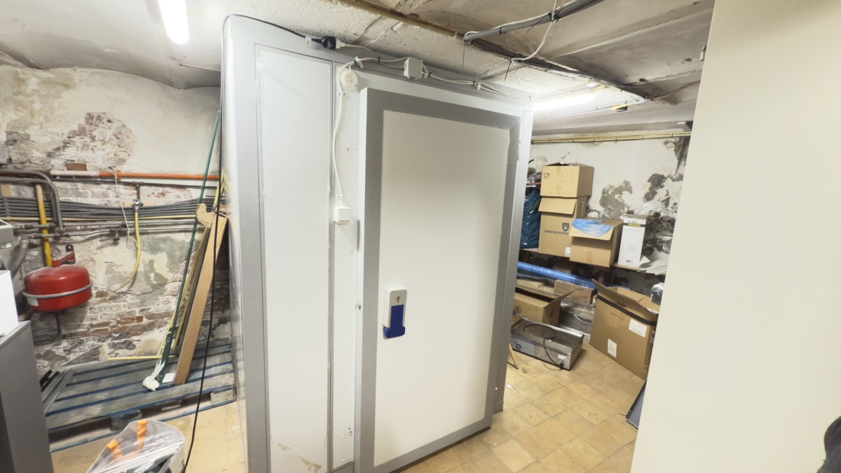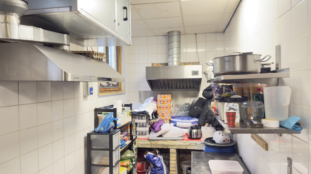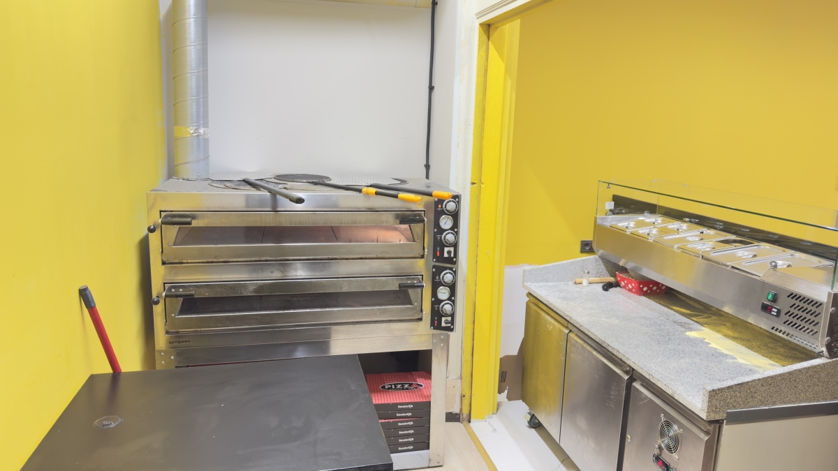 • Achterin een voorbereidingskeuken met koeling en professionele afzuiging